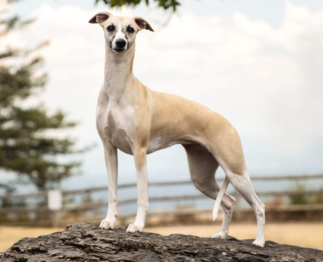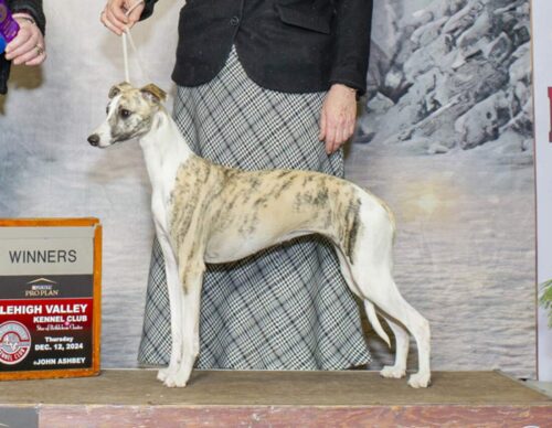 Knight is a GCHB (Grand Champion Bronze) AKC Whippet and a cornerstone of our breeding program. With over 125 AKC points and multiple group placements, he exemplifies the breed standard in both structure and performance.